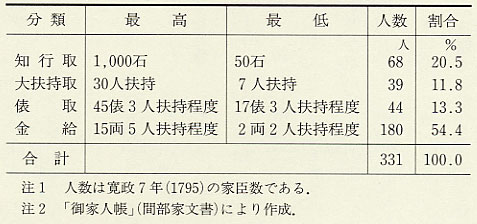 鯖江藩の家臣団は、藩祖詮房が一五〇〇俵の禄をうけた宝永元年に九人の家臣を召し抱えたことに始まる。以後詮房が幕閣の中枢へ進むにつれ、家臣団は増加し、高崎五万石の城主となった同七年までに九八人が召し抱えられ、鯖江転封の享保五年には一二五人であった(「御家人名前」『鯖江市史』)。藩士の人事記録である「御家人帳」(間部家文書)によると、この後下級武士の取立てが加わり、寛政(一七八九〜一八〇一)期以降幕末まで、卒分を除き士分だけでも三一五人から三六〇人程度であった。「御家人帳」などによると、藩士の家禄の表し方は幕末期を除いて表2のような四種類がある。寛政七年における家禄形態別の士分の藩士の人数も表2に示した。