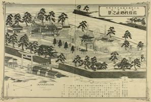 明治32(1899)年、日本名蹟図誌の第5編として名古屋光彰館から刊行された全3冊の地誌。編者の渡辺市太郎(豊陽)は、愛知県出身で刊行当時は京都に在住していました。郡ごとに名所旧蹟を記し、別に「社寺の部」を立てて神社仏閣の縁起と俯瞰図を載せています。本文は『越前国古今名蹟考』や『敦賀十勝』『若狭国志』など先行する地誌に基づいて書かれており、俯瞰図は実際に渡辺がその地を訪れて描いたものです。細密な銅版画による寺社の俯瞰図は、19世紀末当時の寺社の様子を今に伝える貴重な資料として、後に様々な郷土誌に引用されています。当館所蔵本は、郷土史家の山下與平が旧蔵していたもので、大正14年に元からの表紙が破損したために、新しい表紙に付け替えられことが記されています。