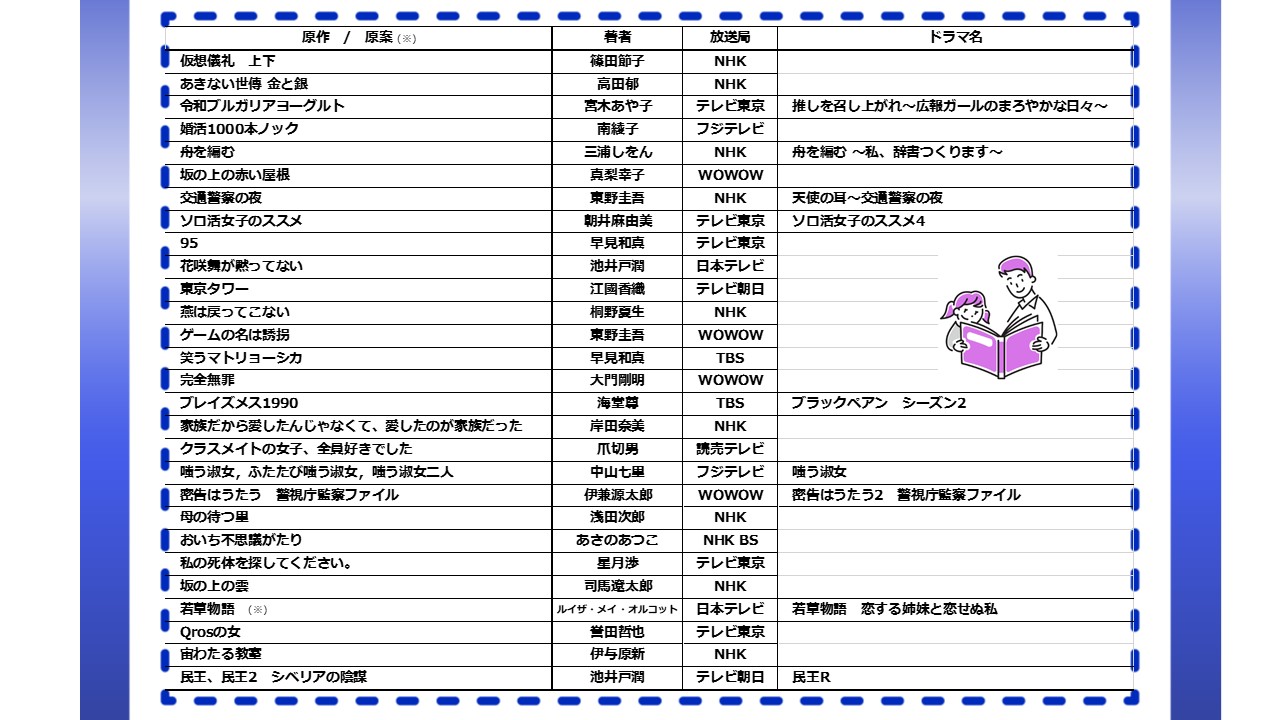 当館で所蔵している、2024年に放送されたドラマの原作(原案)本を集めました。